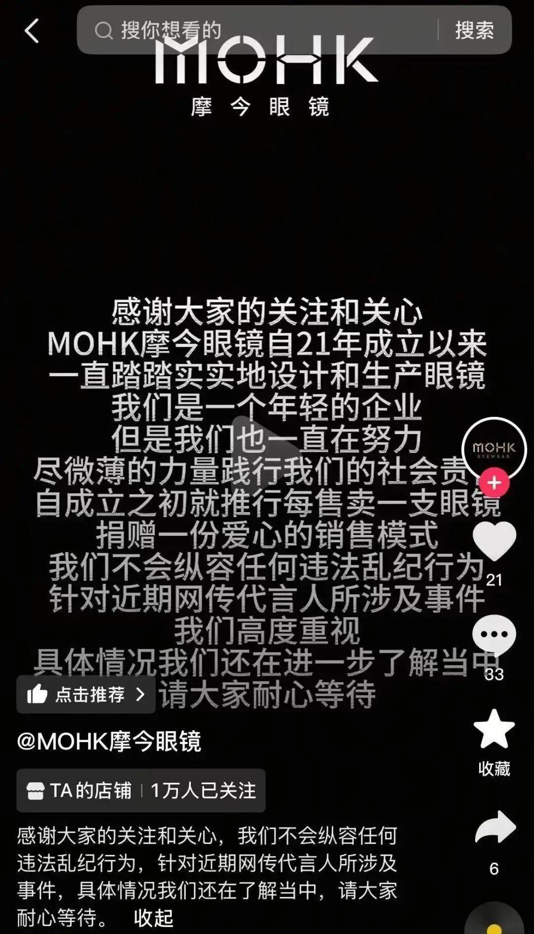 目前,摩今眼镜还处在观望状态,暂时还未与其解约,但品牌回应称:“企业不会纵容任何违法乱纪行为”,并表示: “具体情况还在进一步了解当中,请大家耐心等待”。
