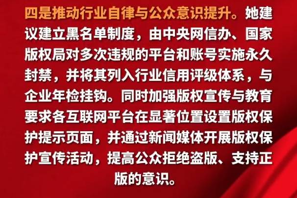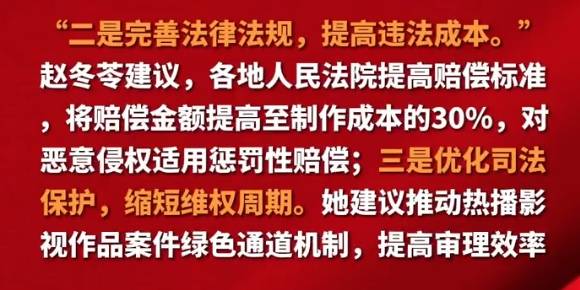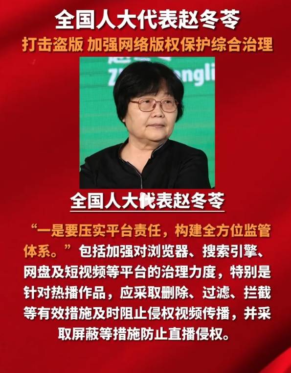 3月4日,全国人大代表、著名编剧赵冬苓在接受采访时坦言:“我去各个平台做过一些调研,发现影视盗版现象确实非常严重。希望有关方面能够联合综合治理一下,同时从法律上也加强对知识产权的保护。”记者发现,影视盗版现象层出不穷,搜索引擎、网盘、短视频平台等,为盗版影视资源的传播扩散提供了温床。可谓“新剧上线5分钟,盗版铺天盖地”。“盗版问题是一场永无止境的‘猫鼠游戏’,必须依靠法律、技术、行业和公众的协同发力,持续性打击。”赵冬苓建议,各地人民法院提高赔偿标准,将赔偿金额提高至制作成本的30%,对恶意侵权适用惩罚性赔偿。