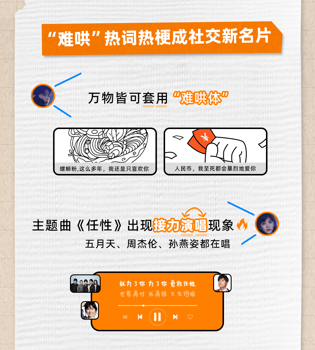 该剧热词热梗作为一种新兴文化现象获年轻人拥趸。由剧中台词“我至死都会暴烈地爱你”“这么多年我还是只喜欢你”引发的“难哄体”席卷社交平台,并被广泛运用到全民场景,辐射各个圈层。网友进可表示:“螺蛳粉,这么多年,我还是只喜欢你”,退可高喊:“人民币,我至死都会暴烈地爱你”,可谓“万物皆可套用‘难哄体’”。