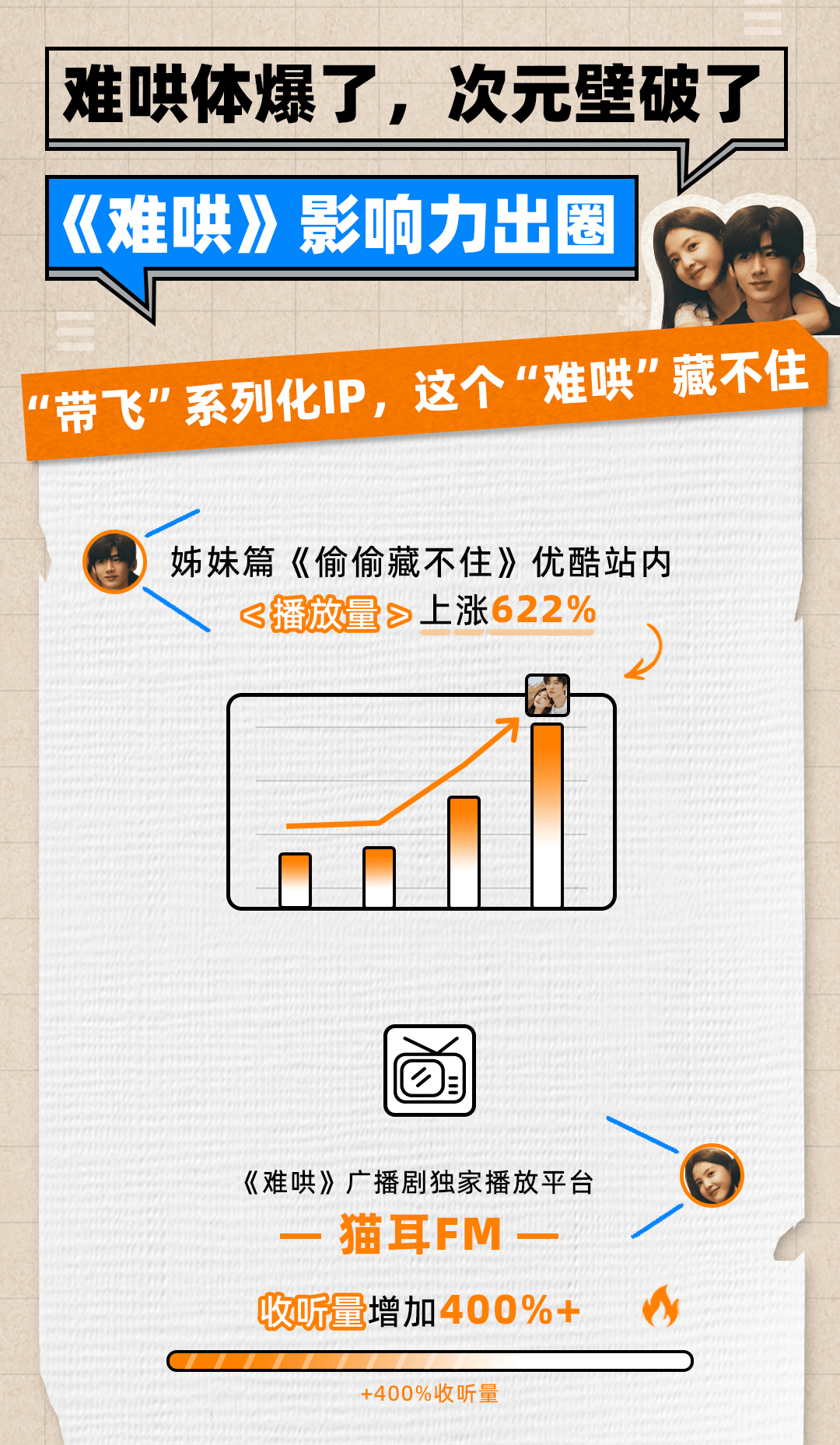 该剧播出后,带动姊妹篇《偷偷藏不住》优酷站内播放量上涨622%,一度飙升至优酷“N刷指数”TOP3。数据显示,已经完结600余天的《偷偷藏不住》超过众多新剧重回云合日榜TOP9。同时,热剧效应也延续到了原著IP,剧集热播期间,在《难哄》广播剧独家播放平台猫耳FM上,同名广播剧收听量增加400% 。