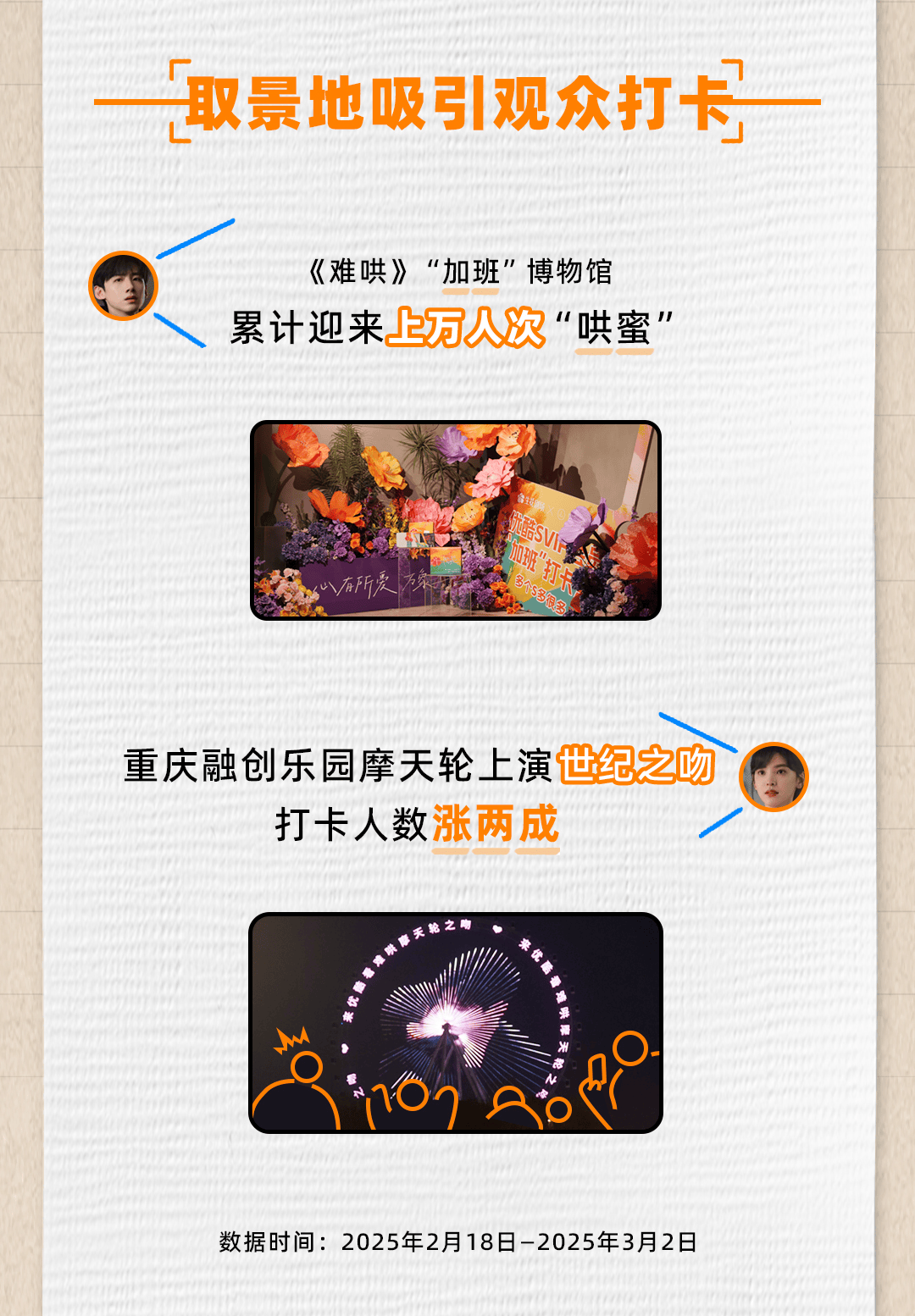 随着剧集热播,网友还争相打卡取景地“加班酒吧”和融创乐园摩天轮。数据显示,“加班”博物馆运营后,两周累计迎来上万人次“哄蜜”打卡;重庆融创乐园摩天轮更是成为剧集热门“应援地”,打卡人数增加两成。