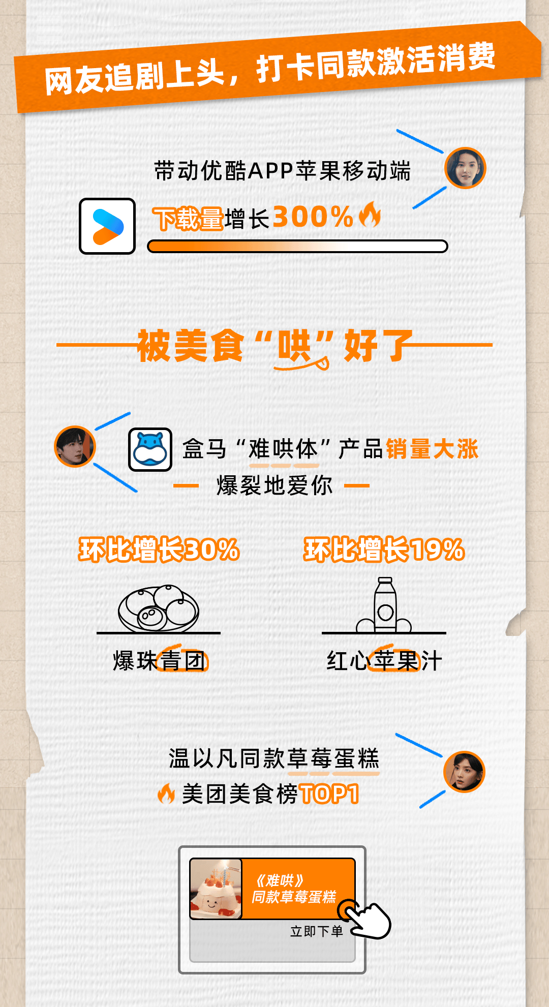 《难哄》以影视作品“小”切口撬动新消费“大”场。开播一周,剧集的火爆带动优酷APP苹果移动端下载量增长近300%,温以凡同款草莓蛋糕登美团美食榜TOP1,盒马也借势在重庆、上海等城市线下30家门店铺设“难哄体”产品,“爆裂地爱你”爆珠青团环比增长30%,红心苹果汁环比增长19%。
