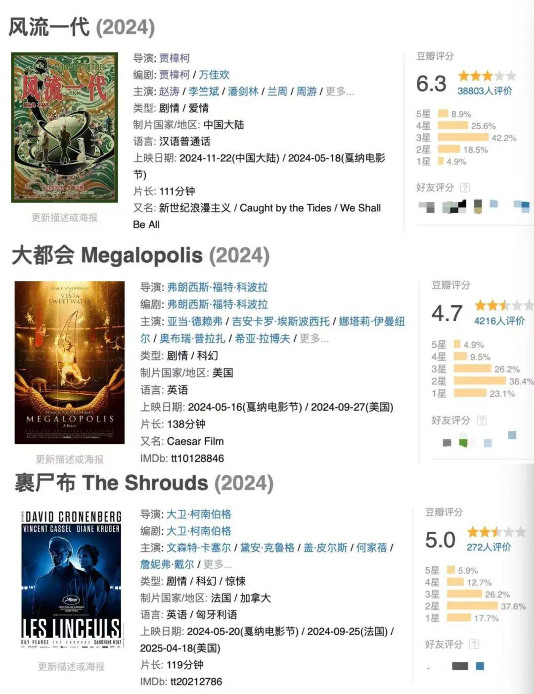 不过2024年,被福茂选进戛纳电影节主竞赛单元的大师新作就集体翻车。包括贾樟柯的《风流一代》、弗朗西斯·福特·科波拉的《大都会》、大卫·柯南伯格的《裹尸布》。