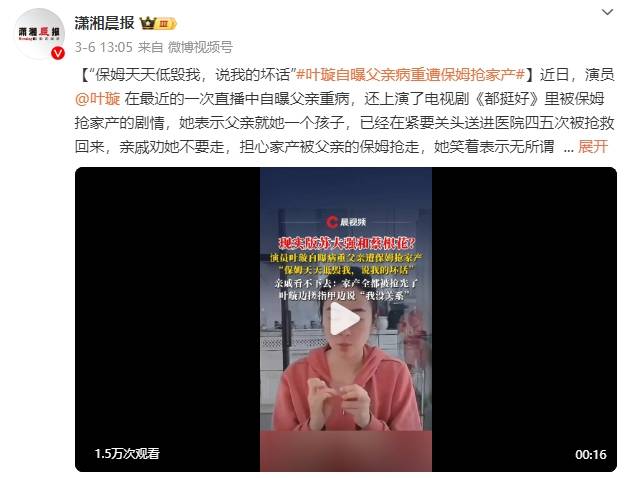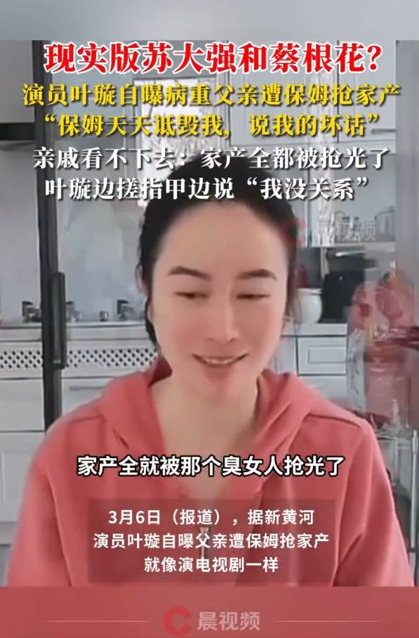 近日,演员叶璇在最近的一次直播中自曝父亲重病,还上演了电视剧《都挺好》里被保姆抢家产的剧情,她表示父亲就她一个孩子,已经在紧要关头送进医院四五次被抢救回来,亲戚劝她不要走,担心家产被父亲的保姆抢走,她笑着表示无所谓。