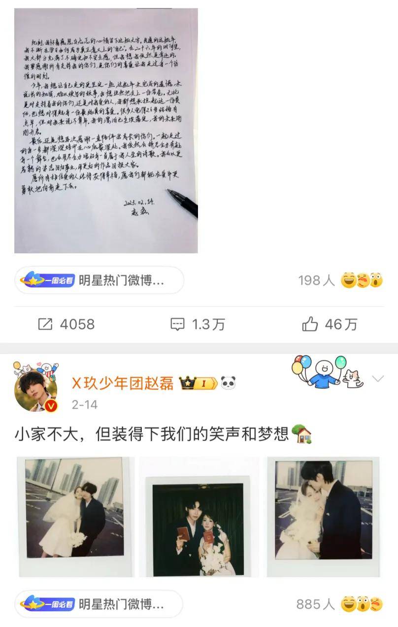 相比之下,偶像团体成员赵磊的微博官宣则因缺乏情感缓冲,直接引发粉丝炸锅。其队友在评论区“塑料味”十足的祝福更是引发了网友热议,被戏称为“内娱男团修罗场名场面”。