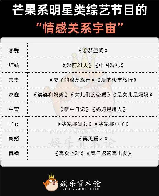 这也是为什么中国综艺节目,尤其是芒果系的综艺节目带正构建起庞杂的“情感关系宇宙”。之前就有人研究过,芒果系一共出品了15档明星情感类综艺,从恋爱涵盖到离婚甚至是再婚,其中包罗了婆媳、母女、亲子等大量的容易造成社会争议的话题。