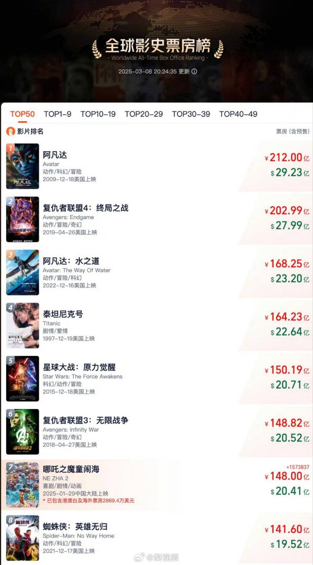 搜狐娱乐讯 3月8日,据网络平台数据,电影《哪吒之魔童闹海》总票房(含点映、预售及海外票房)已突破148亿,距离全球影史票房榜第六位《复仇者联盟3:无限战力》(票房148.82亿元)仅差0.82亿元。