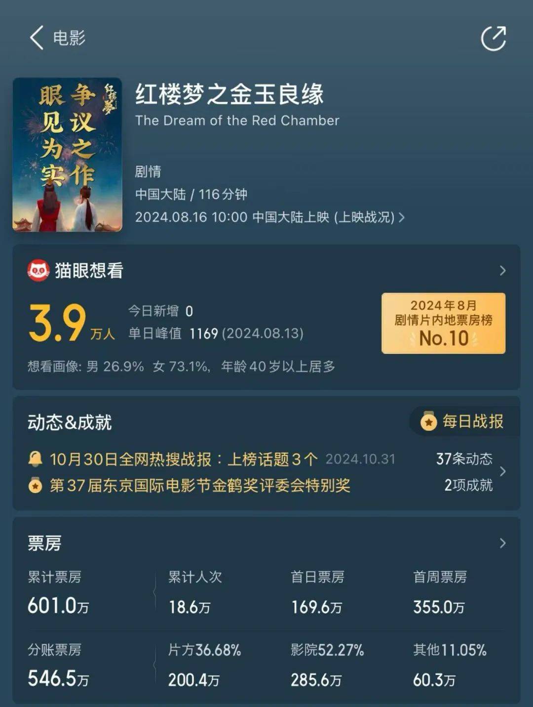 要知道,1989年版本的电影《红楼梦》可是足足拍了735分钟,而去年暑期档上映的胡玫导演的新影版《红楼梦之金玉良缘》虽缩减了片长,却没逃过口碑票房双输的遗憾结局。