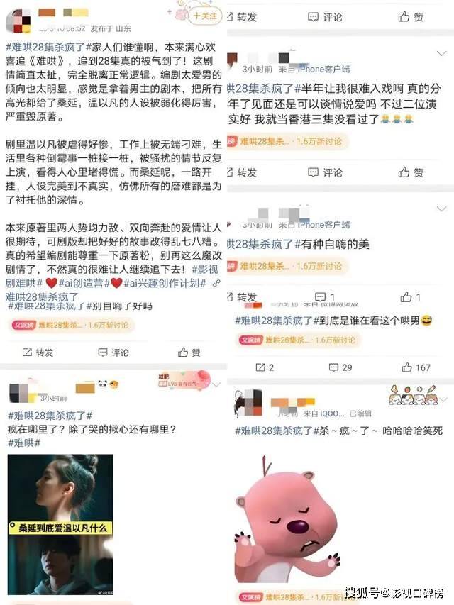 正是因为这样,开播前被吹上天的《难哄》才会高开低走,陷入无人在意的僵局。眼看着剧集快要播到末尾了,3月10日关于“《难哄》28集杀疯了”的话题登上热搜。这集具体讲的是男主桑延亲手抓住了车兴德,却被刺伤缝了针。女主温以凡得知男主桑延受伤后悲伤恸哭。这段在原书里属于名场面,剧集还原又加了些刺激的打斗戏份和娇弱女主破碎感拉满的哭戏,自然会引起部分网友的共情。