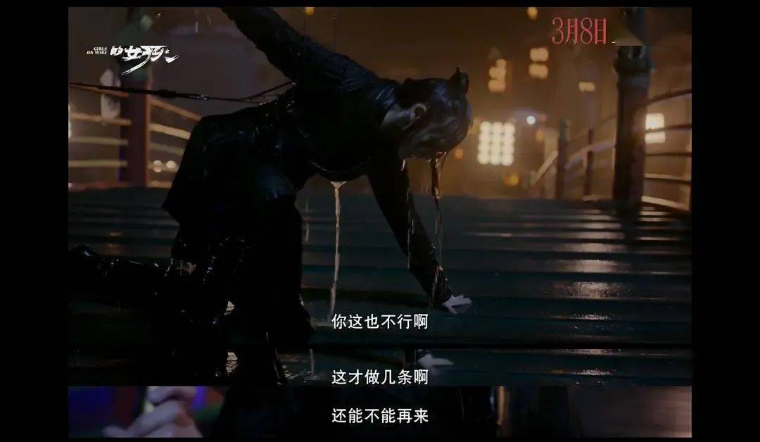 在这个场景里,她的确是在“飞”。但这一次次的飞,更像是被身上的威亚所穿透、所束缚、所控制的,提线木偶般的行为。