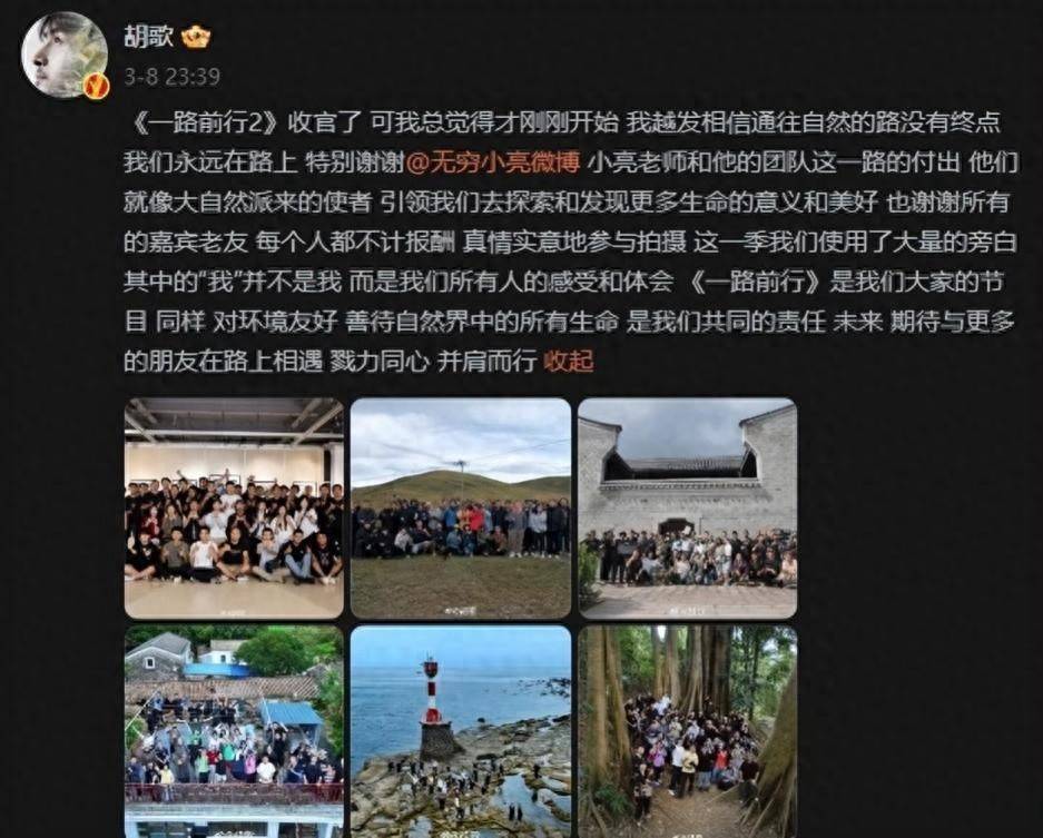 3月8日深夜,胡歌又为《一路前行2》收官更新长文,答谢刘诗诗、袁弘等一众老友不计酬劳参加《一路前行2》,也感谢东方卫视能够有担当制作这档环保节目。