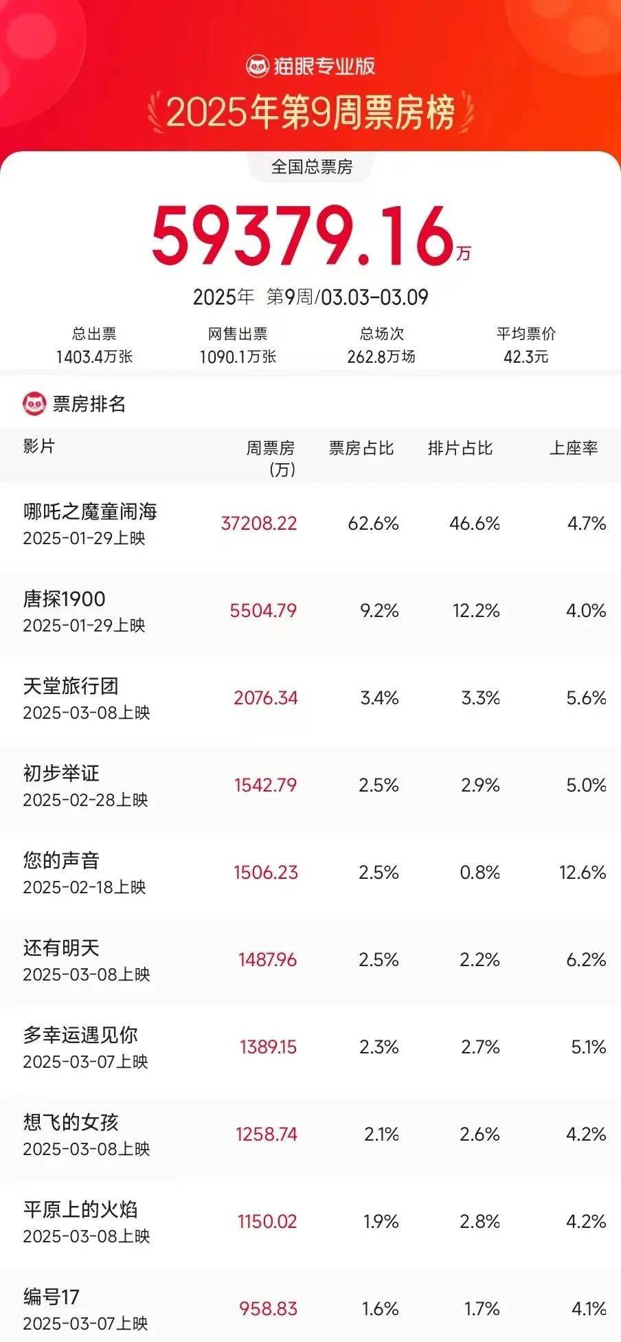 随着《哪吒之魔童闹海》能量大幅减弱,上周影市票房大盘继续缩水。据猫眼专业版数据,03.03-03.09内地一周票房报收5.93亿,较前一周的9.29亿下跌36.1%。