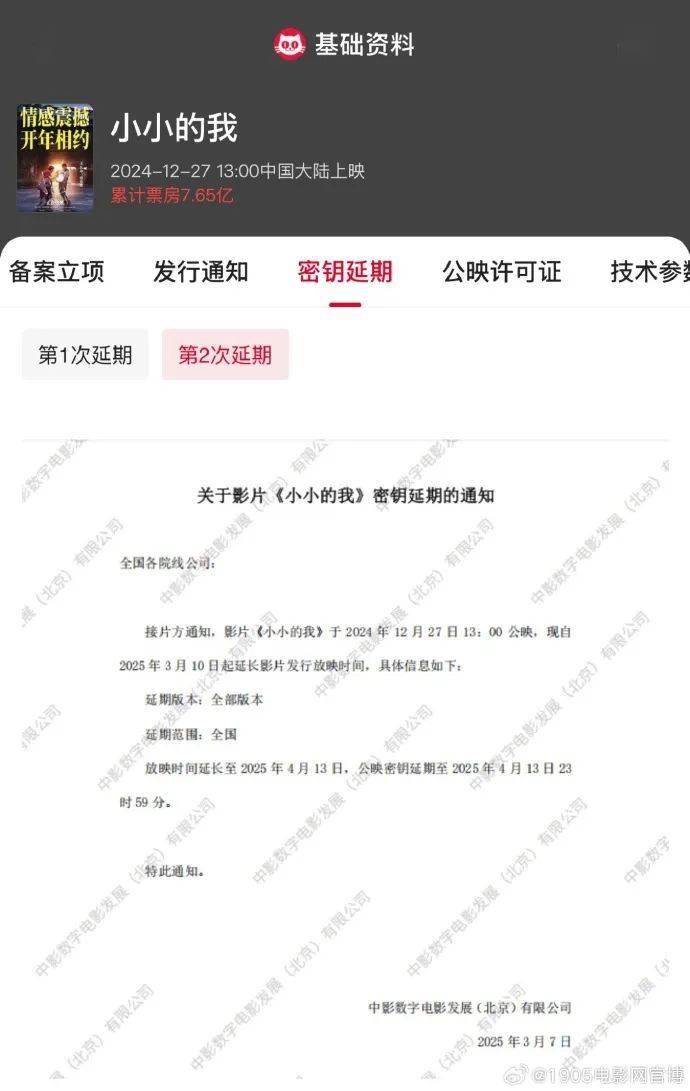 据密钥延期通知,易烊千玺和林晓杰领衔主演电影《小小的我》密钥第二次延期,延长上映至4月13日,截至当前累计票房已超7.65亿。