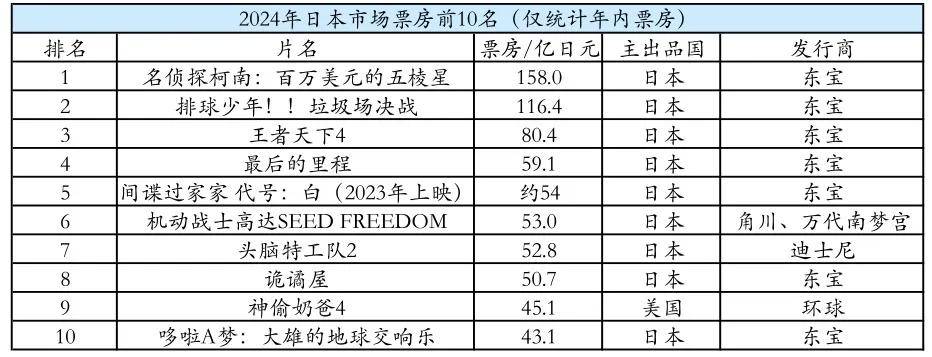 而比中国数据下行更为猛烈的是日本电影市场,好莱坞电影占比从70%的峰值一路跌到33%,2024年日本电影票房前10名中仅有《头脑特工队2》与《神偷奶爸4》两部合家欢动画片上榜,真人电影则全军覆没。