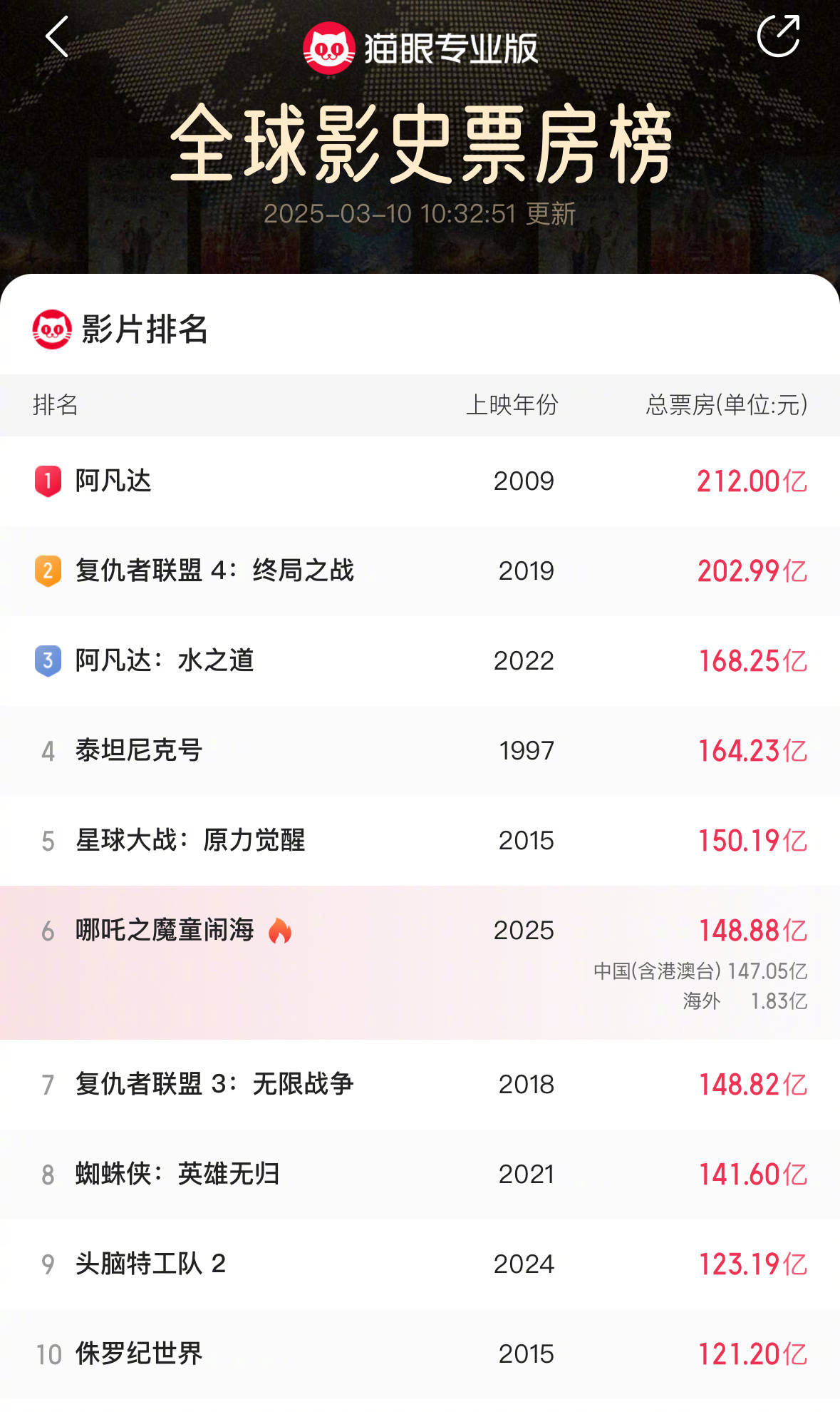 搜狐娱乐讯 据猫眼专业版全球票房榜数据,截至3月10日10:32,电影《哪吒之魔童闹海》全球累计票房(含海外及预售)已达148.88亿,超过《复仇者联盟3》(148.82亿),跃居全球影史票房榜第6名。