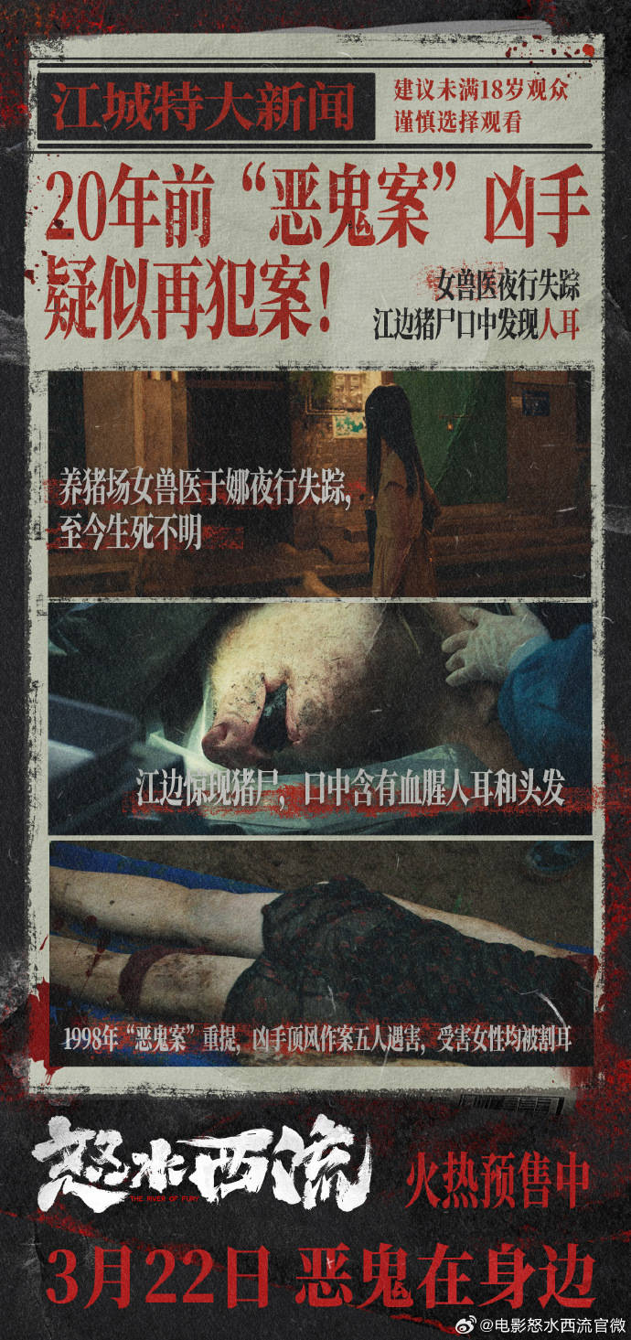先说剧情。《怒水西流》是典型的犯罪、惊悚片,做成报纸质感的海报,基本上交代了故事主线,在虚构出来的江城,警方在猪尸口中发现人耳和已失踪的于娜的头发,怀疑和98年“恶鬼案”密切相关,20年过去,凶犯再次出手,背后到底有怎样的故事和作案动机?
