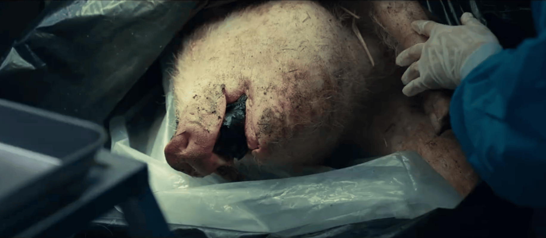 开场陈都灵饰演的于娜,一声惨叫就已经被装进裹尸袋,镜头直面对准猪头,里面有头发,和因为过于血腥打码的耳朵等人体组织。