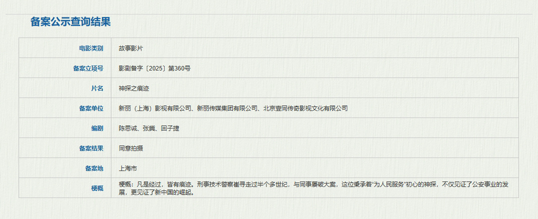 2月24日,据国家电影局关于2025年1月下全国电影剧本(梗概)备案、立项公示的通知,《神探之痕迹》立项,编剧为陈思诚、张冀、回子捷。