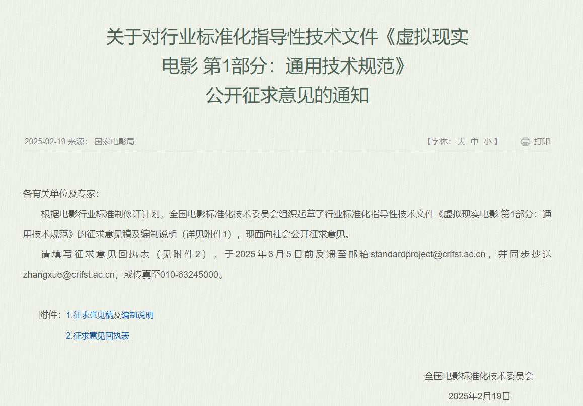 据国家电影局,关于对行业标准化指导性技术文件《虚拟现实电影 第1部分:通用技术规范》公开征求意见的通知。