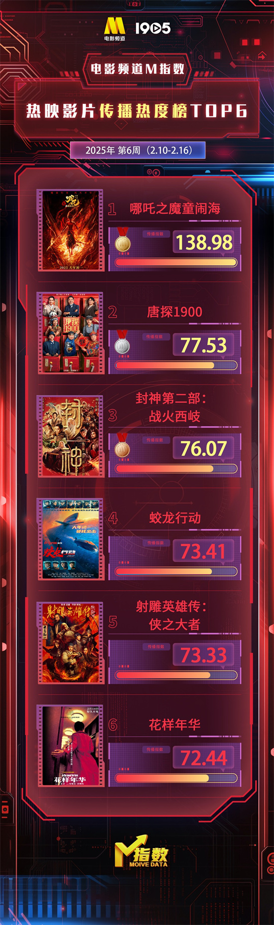 “电影频道M指数”2025年第6周结果发布。2月10日-2月16日,“电影频道M指数”热映影片传播热度榜前6位依次为: