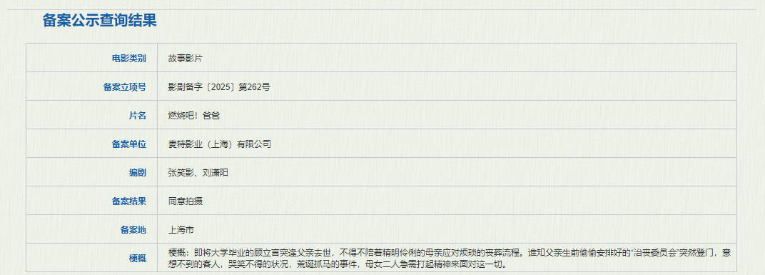 2月17日,国家电影局发布关于2025年1月上全国电影剧本(梗概)备案、立项公示的通知。由张笑影、刘潇阳担任编剧的电影《燃烧吧!爸爸》备案立项,备案单位为麦特影业(上海)有限公司。