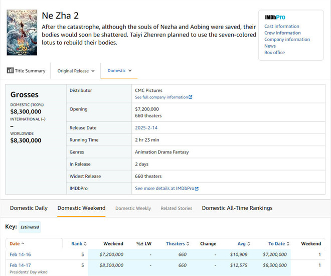 近日,电影《哪吒之魔童闹海》于北美正式上映,首周末(2月14日-2月16日)660馆票房成绩达到720万美元,累计票房达830万美元。目前,电影票房成绩已经超过王家卫《一代宗师》创下的659万美元的北美票房纪录。据外媒估计,电影《哪吒2》将有望冲击千万美元票房成绩!