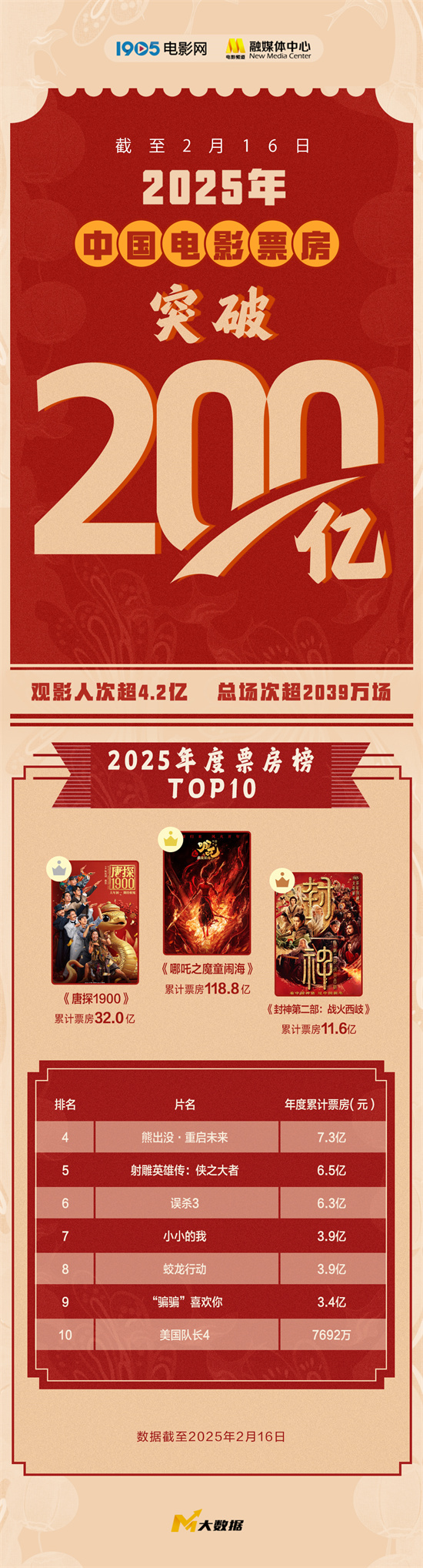 2025年第6周(2.10-2.16)全国电影周票房45.66亿元,观影人次超9893万,2025全年电影票房累计突破200亿元 。
