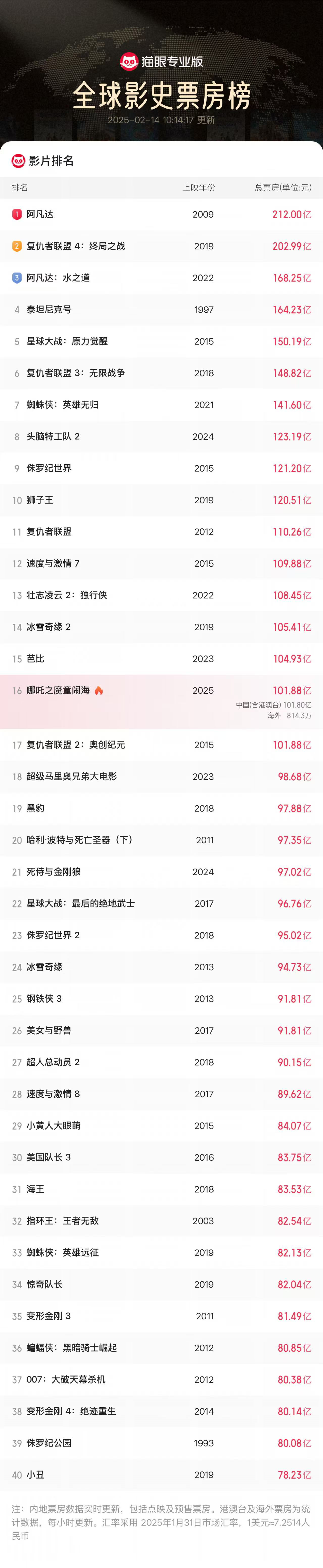 2月14日零时,电影《哪吒之魔童闹海》(下文简称《哪吒2》)总票房破百亿,不仅成为中国影史首部票房破百亿的电影,同时也成为全球影史首部单一市场破百亿人民币(约合14亿美元)的动画电影。截至14日10时许,《哪吒2》总票房(含预售及海外票房)打破《复仇者联盟2:奥创纪元》101.88亿元的成绩,升至全球影史票房榜第16位。