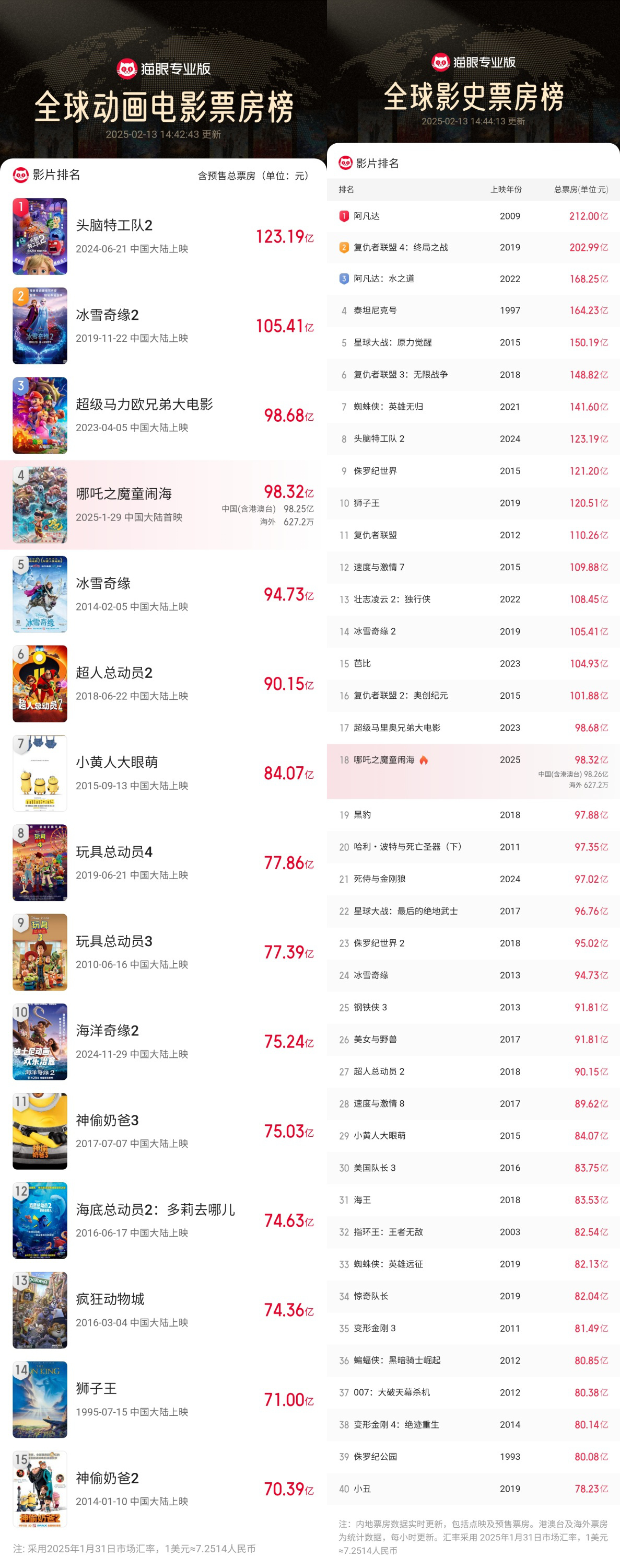 而截至目前,《哪吒之魔童闹海》累计票房(含预售)已经突破98亿元,其中包含海外票仓627.2万元。影片正在向《超级马力欧兄弟大电影》发起冲击,即将近入全球动画电影票房榜前三名!