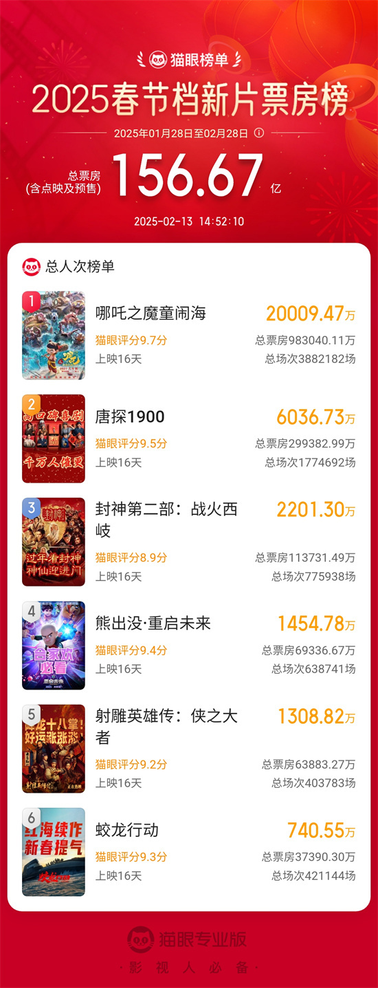 据网络平台数据,截至2月13日14时43分,电影《哪吒之魔童闹海》观影人次破2亿,成为中国影史首部观影人次破2亿电影!