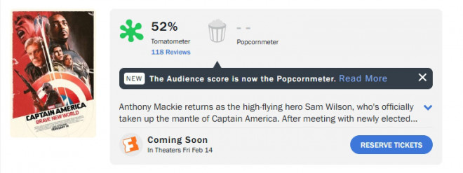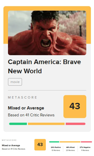 据外媒报道,迪士尼·漫威超英新作《美国队长4》(Captain America: Brave New World)北美开分,烂番茄新鲜度从48%暂升至52%,均分5.6;MTC均分43/100(41评)。《美队4》也是创下该系列开分最低分!