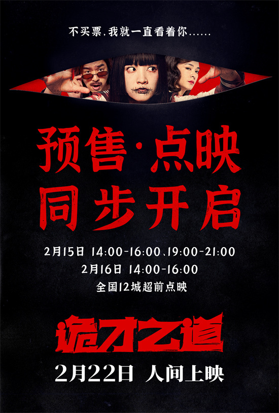 近日,惊恐喜剧片《诡才之道》发布由王若琳演唱的电影主题曲《鬼才出道》MV及海报,并官宣将在北京、上海、深圳、广州、成都、重庆、武汉、西安、杭州、苏州、南京、郑州共十二城开启全国超前点映!电影始于一个编剧的清奇脑洞:如果装“鬼”吓人也有KPI,会是一个怎样的精彩故事?本片由陈柏霖、张榕容、王净、姚以缇、百白、瘦瘦主演。电影2月22日人间上映,影迷一起年后狂欢!