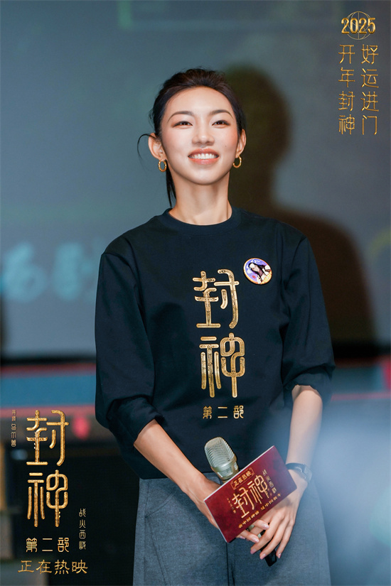 活动现场,于适、那尔那茜、陈牧驰、吴汉坤、百力嘎还合唱了片尾曲《乐土》,还来了一次“高音挑战”,依次用更高的歌声演唱那句“适此乐土,我居我处”,也让现场氛围更加热烈。主创还分别用不同的方式再现了各自角色在影片中的经典台词。于适用东北二人转的方式唱出了“西岐姬发,特为将军洗尘”,那尔那茜则在霸气说出“末将邓婵玉”后,可爱再现了后半句“请为大王讨伐反贼”,反差感十足。不仅如此,主创全员还再现了妲己物色新皮囊时的“眼神杀”,将全场氛围推至高潮。