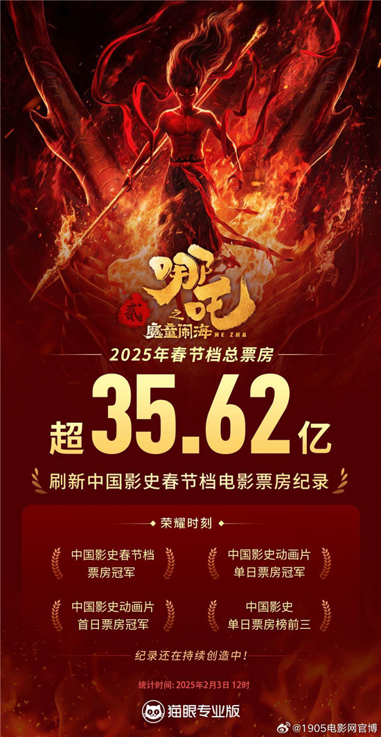 据票务平台数据显示,电影《哪吒之魔童闹海》春节档(档期内票房)总票房破35.62亿,刷新中国影史春节档电影票房纪录,超《唐人街探案3》春节档(档期内票房)票房成绩,成为中国影史春节档(档期内票房)票房冠军!