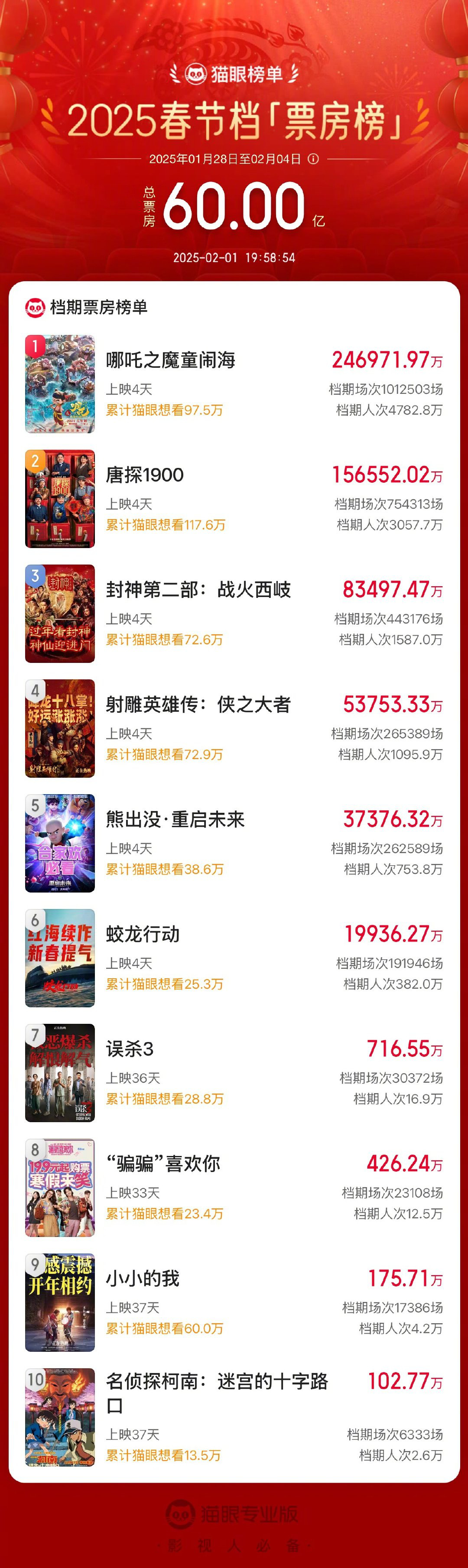 据猫眼专业版数据,2月1日19时58分,2025春节档总票房(含预售)破60亿!《哪吒之魔童闹海》《唐探1900》《封神第二部:战火西岐》分列春节档票房榜前三位。