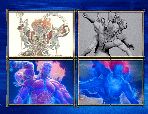 作为完全存在于想象中的数字角色,三头六臂殷郊法相也是制作团队口中“数字角色里最难的一个”。资深概念设计四季介绍道:“殷郊法相的设计阶段从2016年一直延续到2024年,仅雕塑小稿就不下10版。”在其造型设计上,制作团队借鉴了永乐宫壁画中天猷元帅的形象及青龙寺壁画三头六臂明王法相图,打造出“面如蓝靛,发似朱砂”极具辨识度的外表。而在颜色和质感设计上,殷郊法相则参考了蓝色琉璃药师佛的形象,整体呈现出三重投影般的能量体形态。导演乌尔善表示:“殷郊法相并不是物理学意义上的身体膨胀,而是昆仑法力作用下的能量投射。三头六臂之间可以随时交叠,但并没有肌肉和骨骼的牵拉。”对于能量体形态的动态呈现,视效制片人高鸣璐表示:“殷郊法相的体内一直有能量在不停流动,是一个亦虚亦实的结合。”
