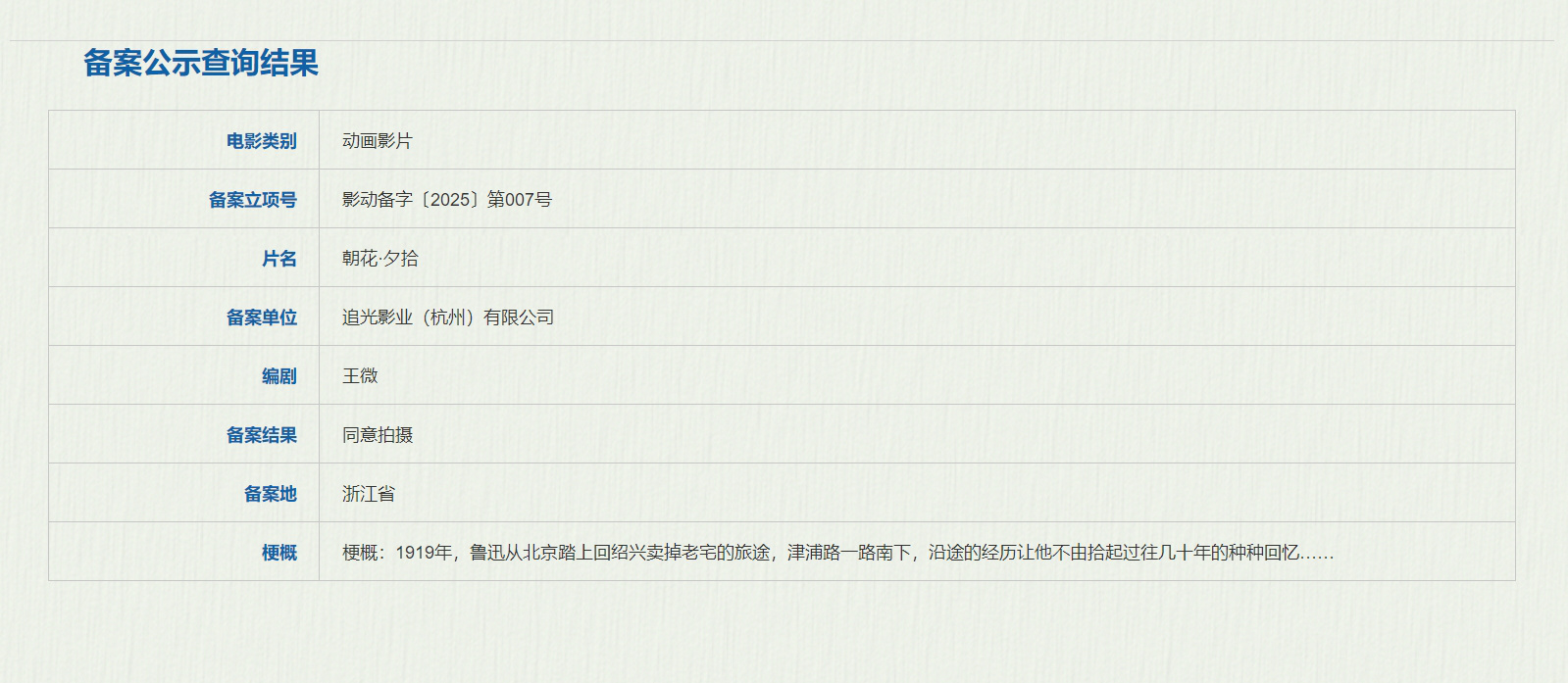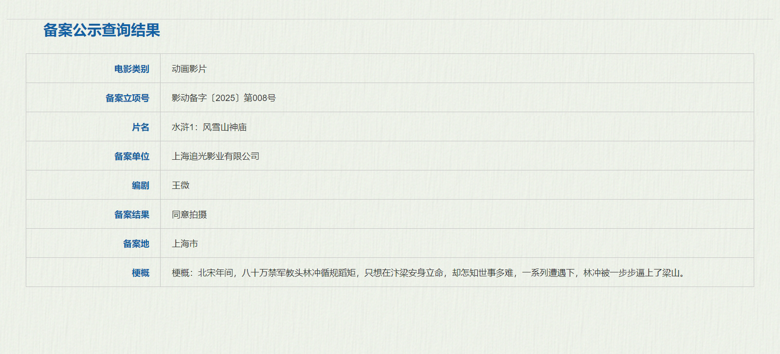 1月26日,据国家电影局关于2024年12月下全国电影剧本(梗概)备案、立项公示的通知,上海追光影业有限公司动画电影《朝花·夕拾》《水浒1:风雪山神庙》立项。两部影片由曾担任《白蛇》三部曲、“新神榜”系列、《长安三万里》编剧的王微撰写剧本。