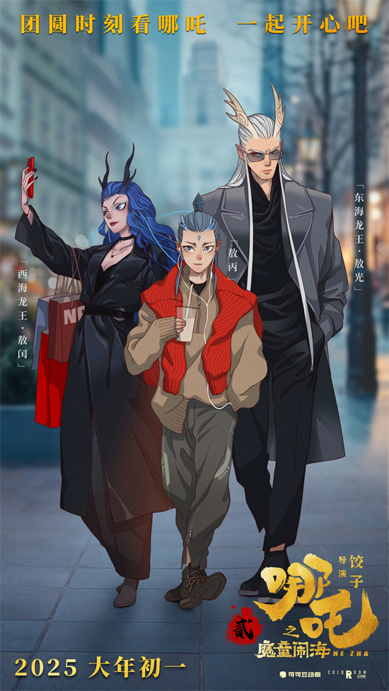 五年后,哪吒终于与父母一同踢毽子,补上了心愿。殷夫人的“踢个毽子会死人啊”与李靖“我堂堂武将”的flag言犹在耳,想象中父慈子孝的画面被哪吒的一身魔力打破,一个毽子没收住力就将父母纷纷踢到了墙上。即使身负重伤,亲爹滤镜拉满的李靖也忍不住夸赞哪吒“不愧我儿”。热烈的爱意滋养着魔童哪吒,也让人想起了在春运旅途终点等待、默默爱着我们的亲人。穿越时间、奔赴万里,只为一次团圆。两张全家福海报分别展现出哪吒、敖丙两家人不同的风格。“小孩哥”哪吒带着墨镜叼着棒棒糖,风火轮化作平衡车,一家人红火出街;沉稳内敛的敖丙一家颜值超高,充满神秘感。