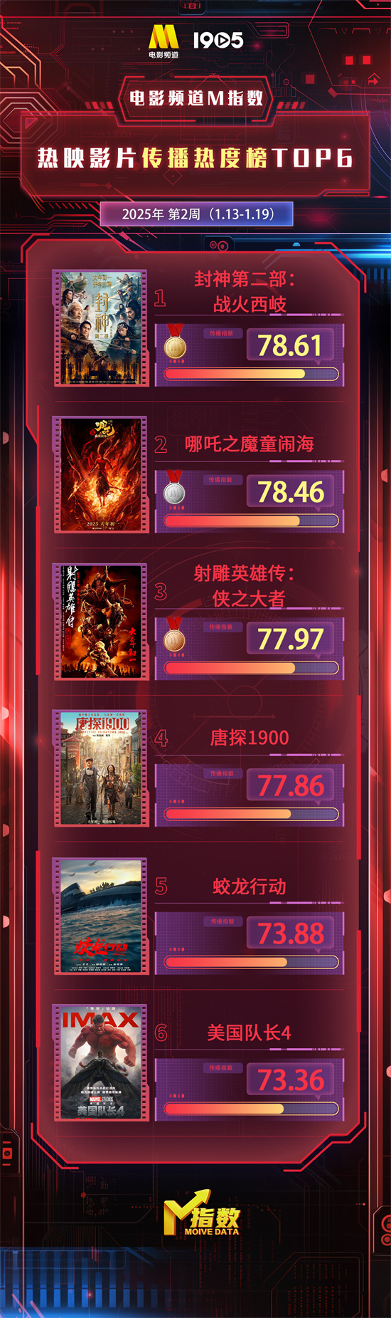 1月13日-1月19日,“电影频道M指数”热映影片传播热度榜前6位依次为: