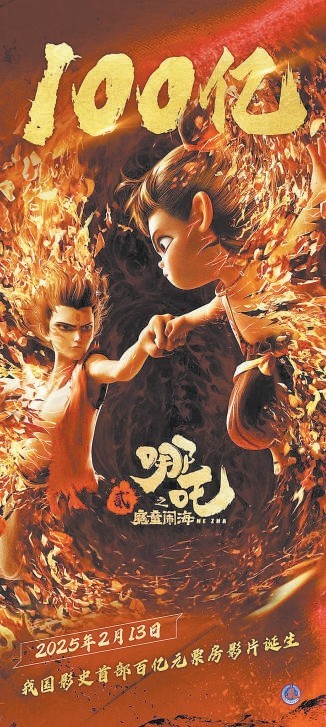 动画电影《哪吒之魔童闹海》自春节上映以来,接连打破票房纪录。据猫眼专业版数据,截至昨天晚间,该片票房已突破100亿元(含预售),成为中国影史上首部百亿元票房影片,创造中国影史奇迹。