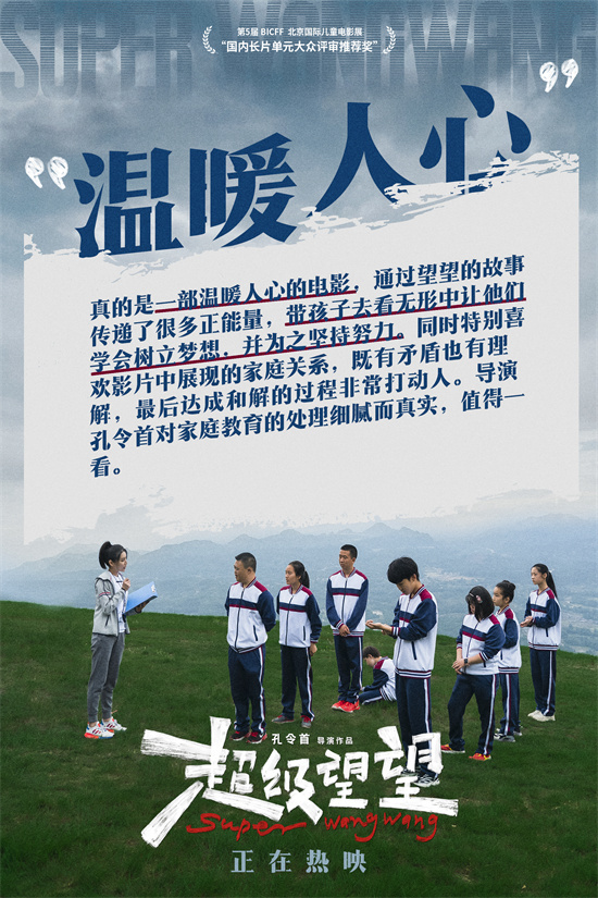 由导演孔令首执导,程云屏山、刘猫猫、孔令首编剧,潘斌龙、吴雨泽、樊昱君、李庆誉领衔主演,沙宝亮、戴笑盈、马丽、刘波友情出演的励志喜剧电影《超级望望》目前全国热映中。影片讲述了有智力障碍的望望从寻找梦想、确定梦想、追逐梦想,到成就梦想的过程,笑泪交织,温暖治愈,以一部电影,走进孩子的内心,打破家长与孩子之间的距离。