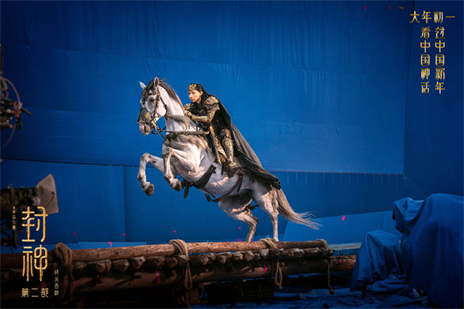 特辑中我们不仅能看到姬发与邓婵玉驰马挥戈的精彩打戏,更有两军铁骑齐出、势如破竹的震撼场面。成群战马齐头并进,战场上铁蹄如雷,两军交锋的恢宏气势可见一斑。马术总监苏荣介绍:“《封神第二部》马戏的拍摄调动了超200匹马,可以看到马战的震撼与冲击力。”