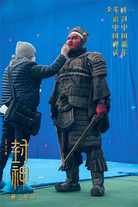 屹立于殷商铁骑阵前,魔家四将各持法器,超过12米的身形尽显其压迫感与威慑力。导演乌尔善介绍,魔家四将并非依靠特效制作而成,而是借助特效化妆与MOCO拍摄,全部由真人实拍完成。影片中,魔家四将的造型灵感来源于唐代吴道子的《八十七神仙卷》。特效化妆师李珍妮分享道,为了“成为角色”,演员全身特效化妆时间长达4小时。而在拍摄上,剧组则利用MOCO及升格拍摄的方式,展现出其巨人身姿带来的重量感。