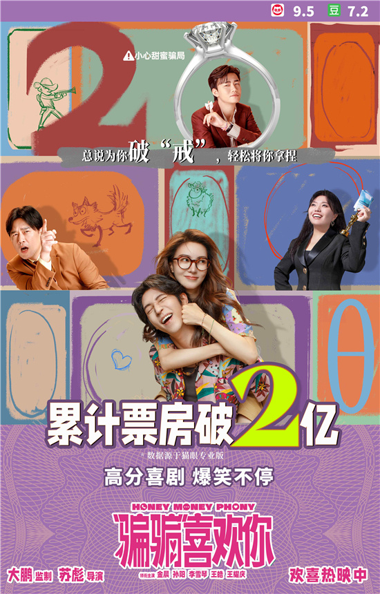 由金晨、孙阳主演的电影《“骗骗”喜欢你》累计票房突破2亿,影片讲述了被骗财骗感情的女主角林晴朗(金晨 饰),结识了骗场高手欧阳晖(孙阳 饰),两人一拍即合,联合闺蜜董晓惠(李雪琴 饰)组成反渣联盟,布下“假豪门”智斗真渣男张子骏(王皓 饰),欧阳晖的舅舅柏仕通(王耀庆 饰)也来助力反骗海王,骗子成团笑虐渣男的故事。
