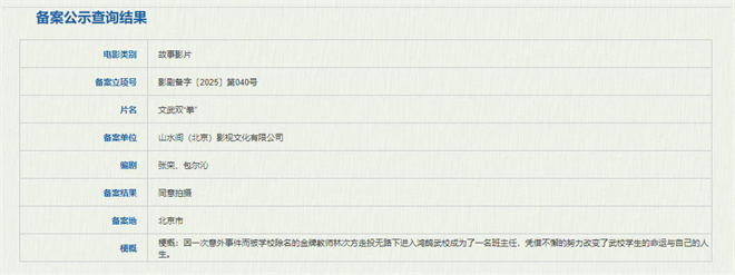 1月3日,国家电影局发布关于2024年12月上全国电影剧本(梗概)备案、立项公示的通知。由张栾(《老师·好》《熊猫计划》)、包尔沁担任编剧的电影《文武双“拳”》备案立项。