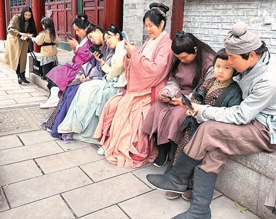 在横店影视城华夏文化园的一片仿古建筑街区,记者见到一个正在进行拍摄的短剧剧组。现场布置成一个古代集市场景,除了有摄像、灯光等十来名剧组工作人员,还聚集着不少群众演员。