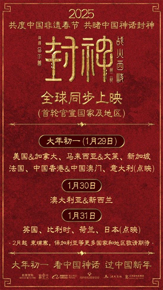 近日,电影《封神第二部:战火西岐》正式公布美国、加拿大、新加坡、法国、意大利、澳大利亚、新西兰等海外多地海报,并宣布将于春节档在海外上映。其中,美国&加拿大、马来西亚&文莱、新加坡、法国、中国香港&中国澳门、意大利等地将同步内地,于大年初一(1月29日)上映。