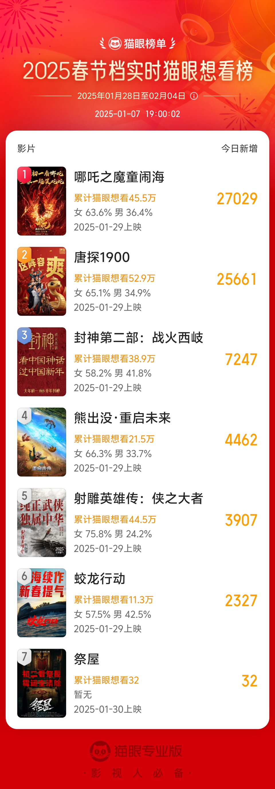 2025春节档实时猫眼想看榜排名情况(截止1月7日19:00 )