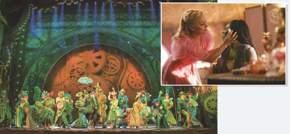 电影《魔法坏女巫》是成功的,它创造了音乐剧改编电影的最高首周末票房。电影剧照。 音乐剧演出照。 制图:李洁