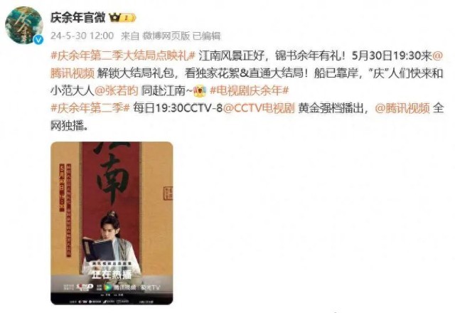 5月30日中午,《庆余年2》宣布5月30日19:30可在腾讯视频解锁大结局礼包,看独家花絮&直通大结局。